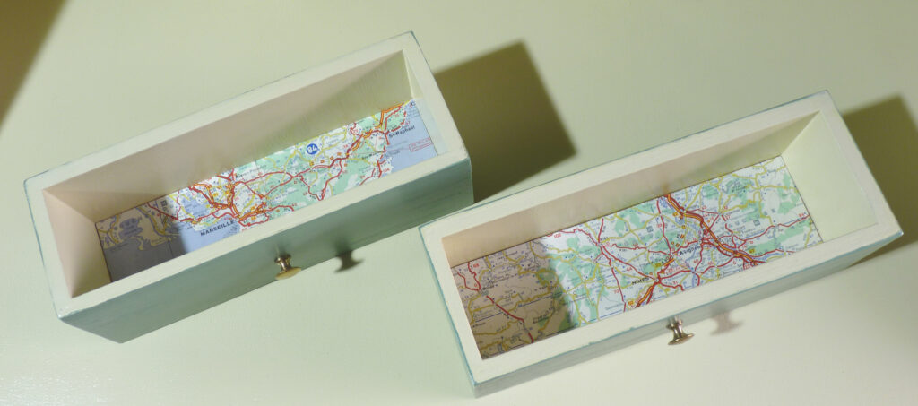 Le sous-main et les fonds des 2 petits tiroirs ont été réalisés en liège et recouvert d’une carte de France de récupération.