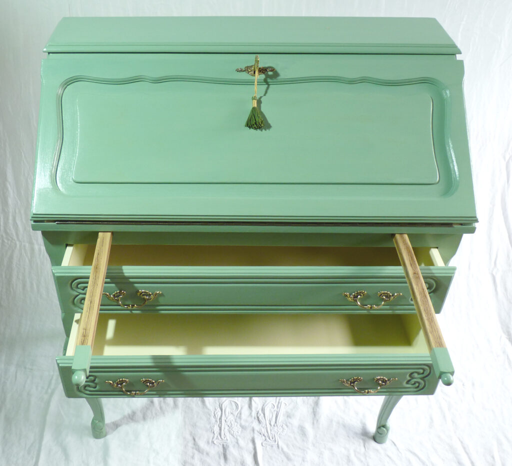 Dès que je l’ai vu, j’ai flashé dessus. Le coup de cœur. Mais ça se voyait qu’il n’était plus tout jeune. Qu’importe. Son air vintage me plaisait plus que tout et notre différence d’âge ne me faisait pas peur. De plus, il était d’accord pour que je m’occupe de lui. Ni une ni deux, j’ai pris mes ciseaux, mes pinceaux et de la couleur. Je me suis activée, j’ai tourné autour de lui pendant des heures pour révéler sa beauté. Je vous le présente donc : voici Clotaire mon sublime secrétaire !